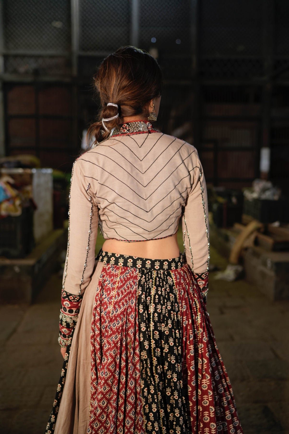 Crafted in pure khadi cotton, this jacket-style blouse is a masterpiece of heritage and bold creativity. It features indirect mirror work, hand-attached metal shells, antique coin embellishments, and intricate thread stitch detailing. The blend of textures and techniques brings an edgy, handcrafted elegance to traditional Navratri wear.