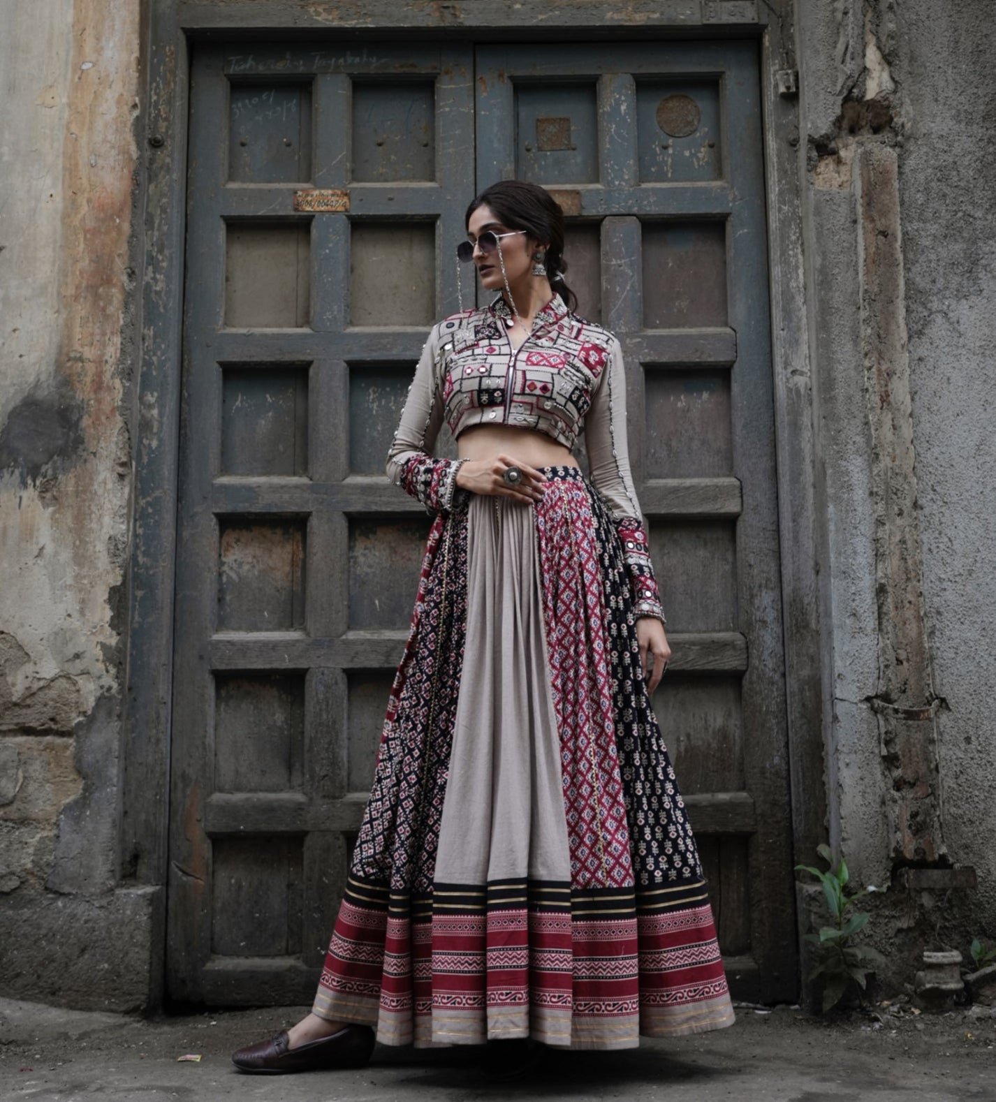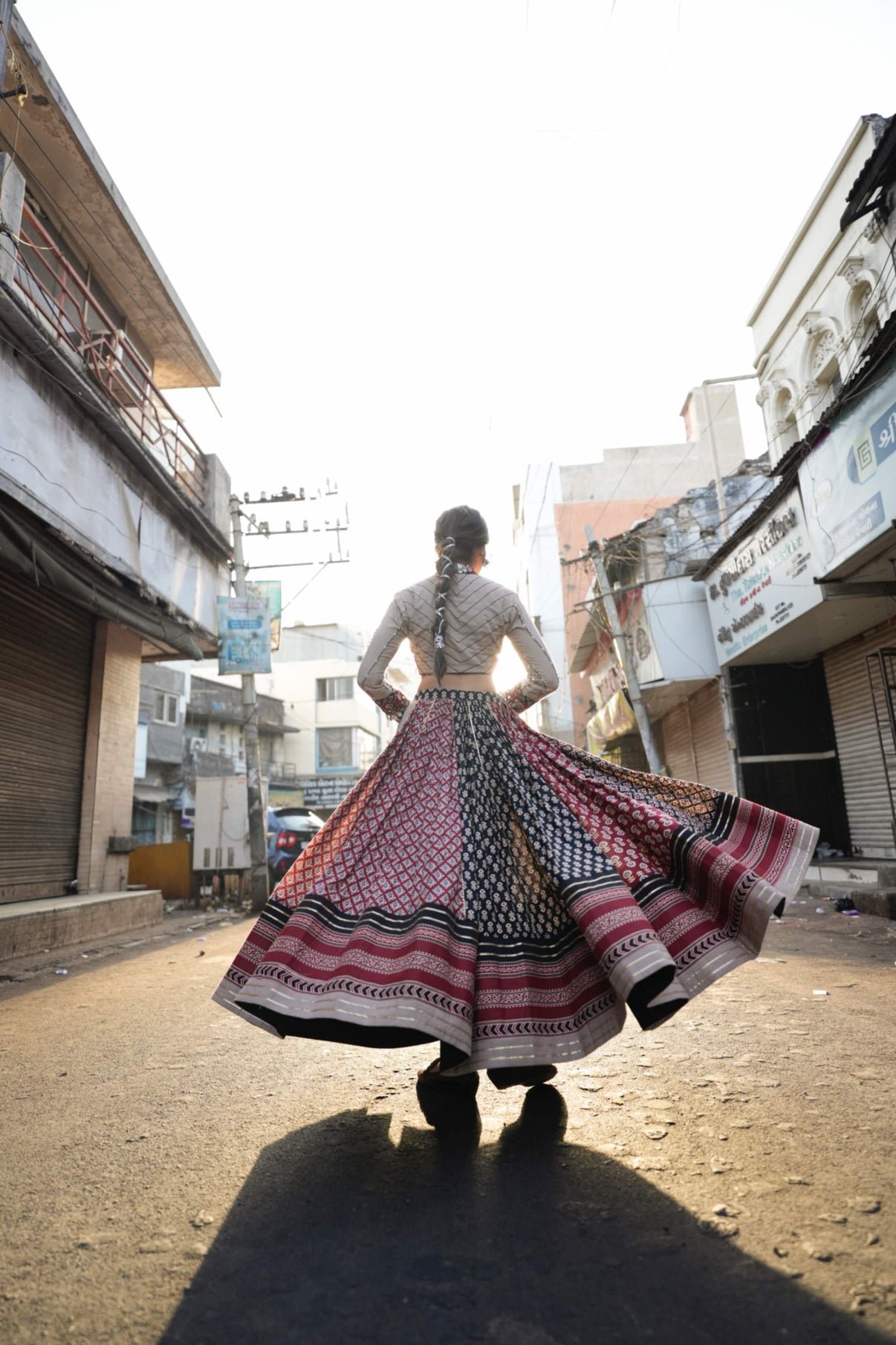 This show-stopping Ajrakh print skirt comes with a magnificent 12-meter flare, offering a regal and dramatic look. The panelled design showcases traditional block printing in earthy tones, flowing beautifully with every twirl. Lined for comfort and perfect movement, it’s made to rule the Garba circle.